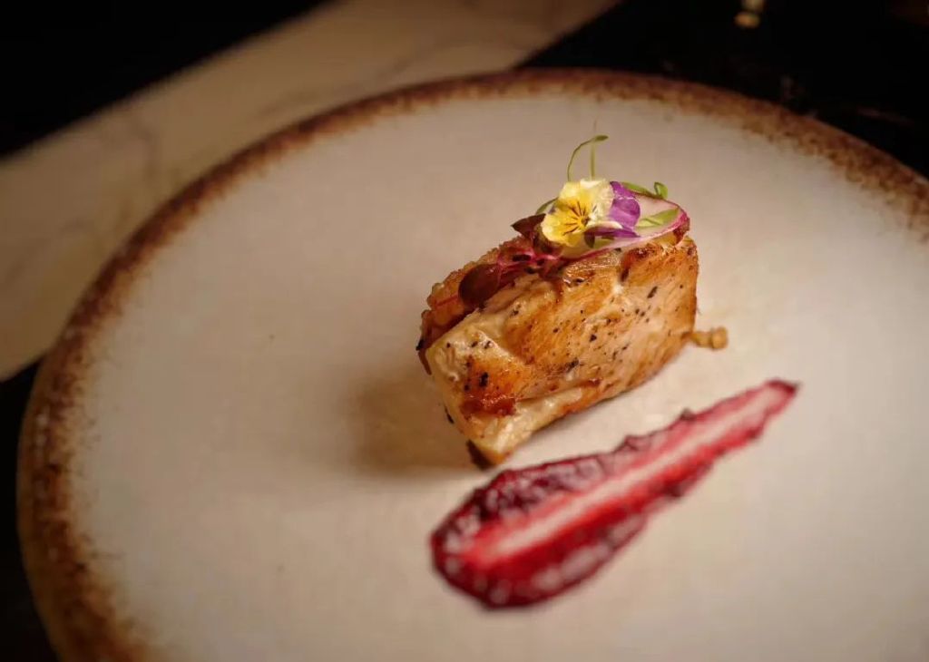 这道炭烤脆皮乳鸽由松木烘烤,那蓬松的外皮脆感,刚好适合淋酱中的梅干菜扮演解腻增味的角色。同一道菜,他理解到的甜芒果、醋渍红葱头…的交织,让绳扎后保留足够汁水的乳鸽腿及柔嫩胸肉,能在舌尖和谐演奏。