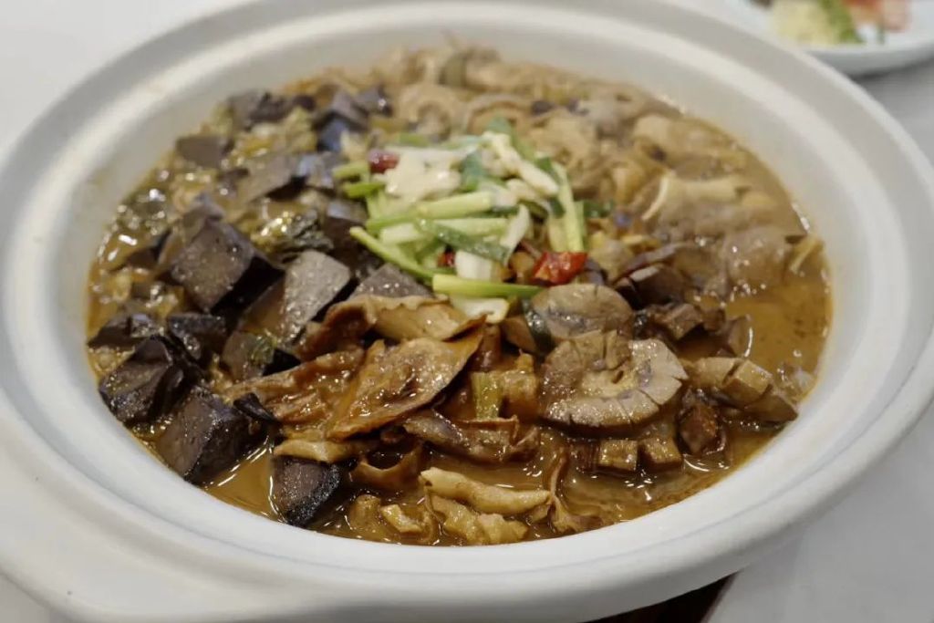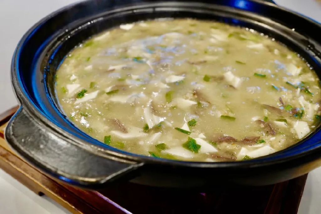 说到高邮的汪豆腐,同姓的汪曾祺先生说过:“汪豆腐好像是我的家乡菜。豆腐切成指甲盖大的小薄片,推入虾子酱油汤中,滚几开,勾薄芡,盛大碗中,浇一勺熟猪油,即得。叫做汪豆腐,大概因为上面泛着一层油。”这次汪豆腐多了鸭血吸猪油香,与豆腐一起,口感一脆一绵。