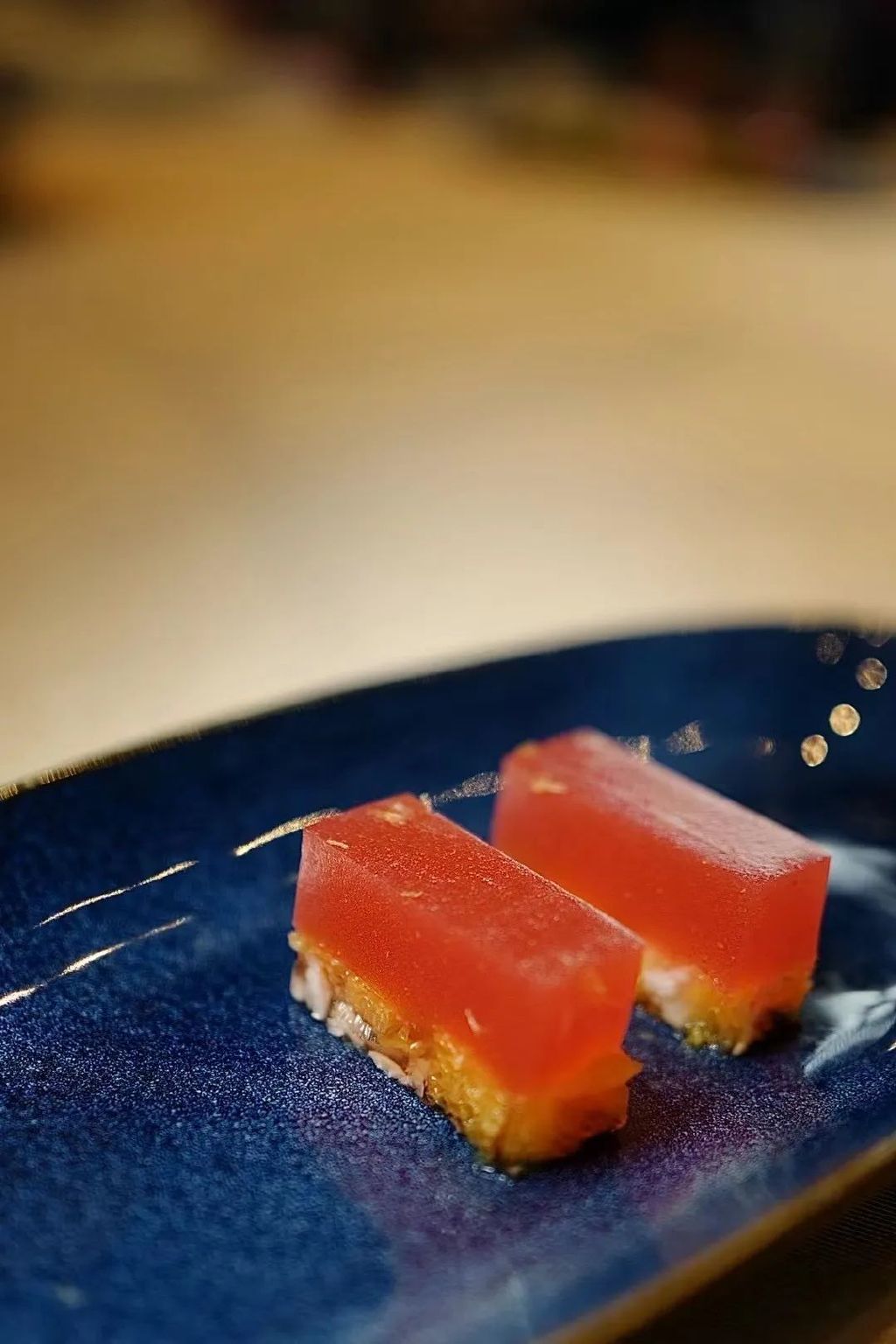 日本响螺与响螺酱的搭配我第一次吃,这刺身里的小亮点与后面的煮物鲍鱼呼应,奶油鲍鱼肝酱的圆润咸鲜是我爱的,只是没想到原来日本极品鲍的研磨末也是用来做盐用的。最后有利尻昆布酱与鱼子酱撞击的甜,让夏天不单调。