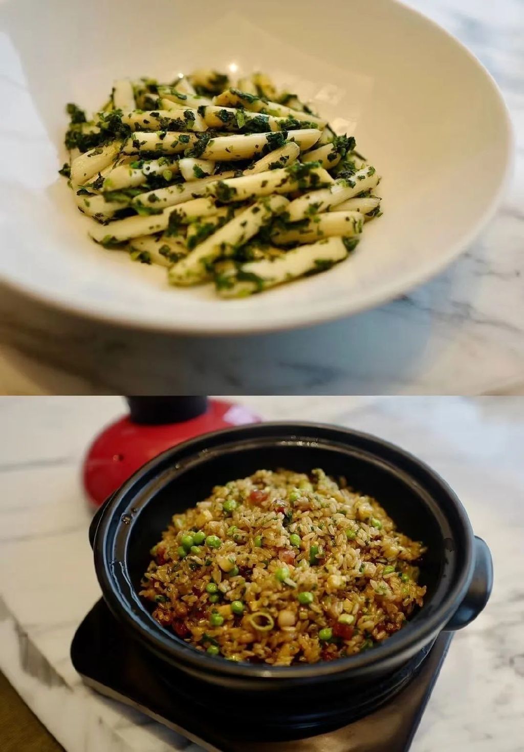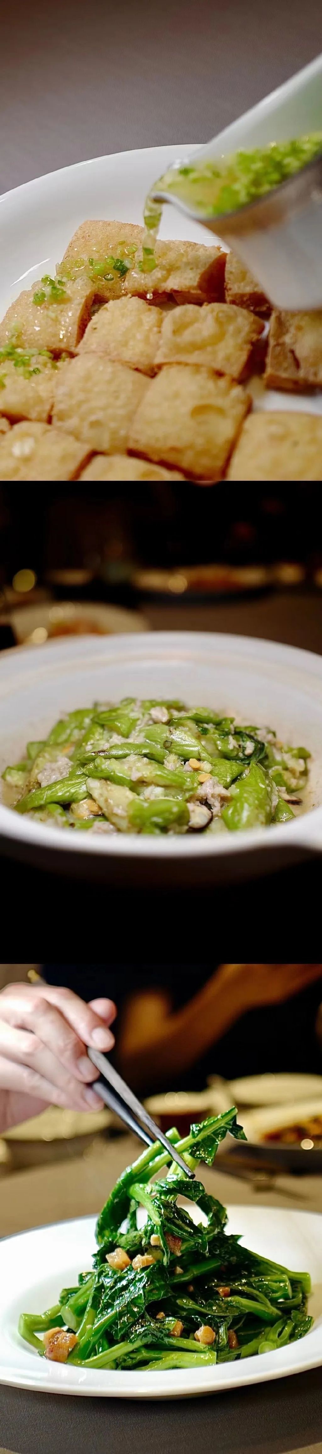 砂锅蒜苔炒澳洲和牛肉、南浔香干芦蒿炒香芹、荠菜囗蘑炒鲜笋都是时令又精巧的食材。