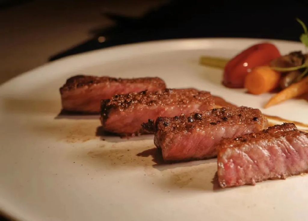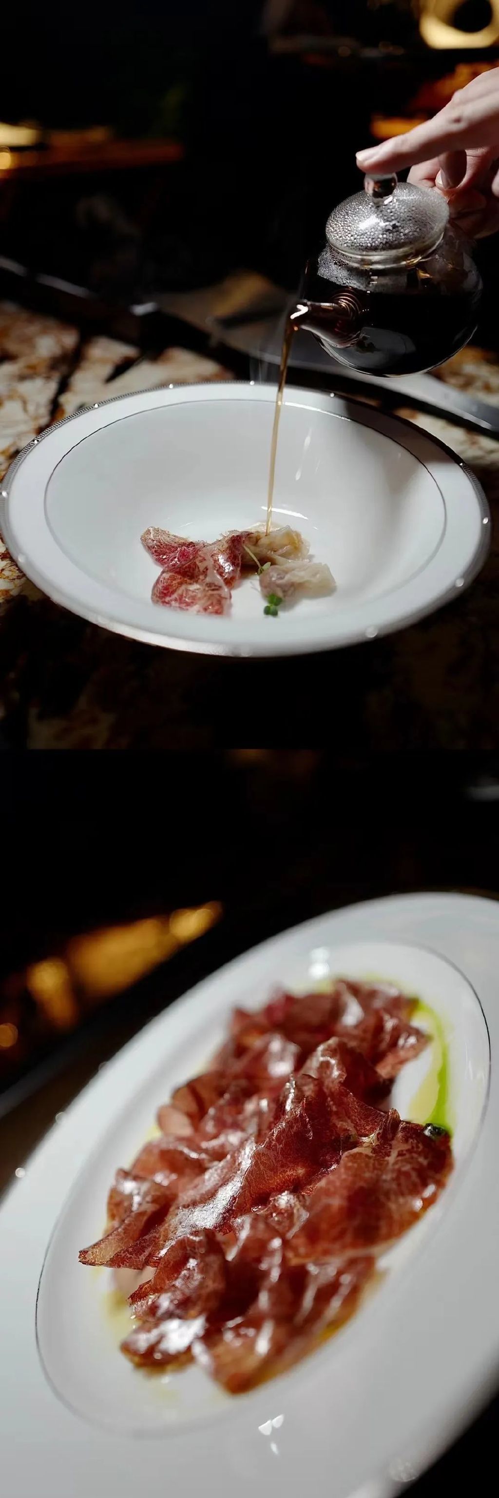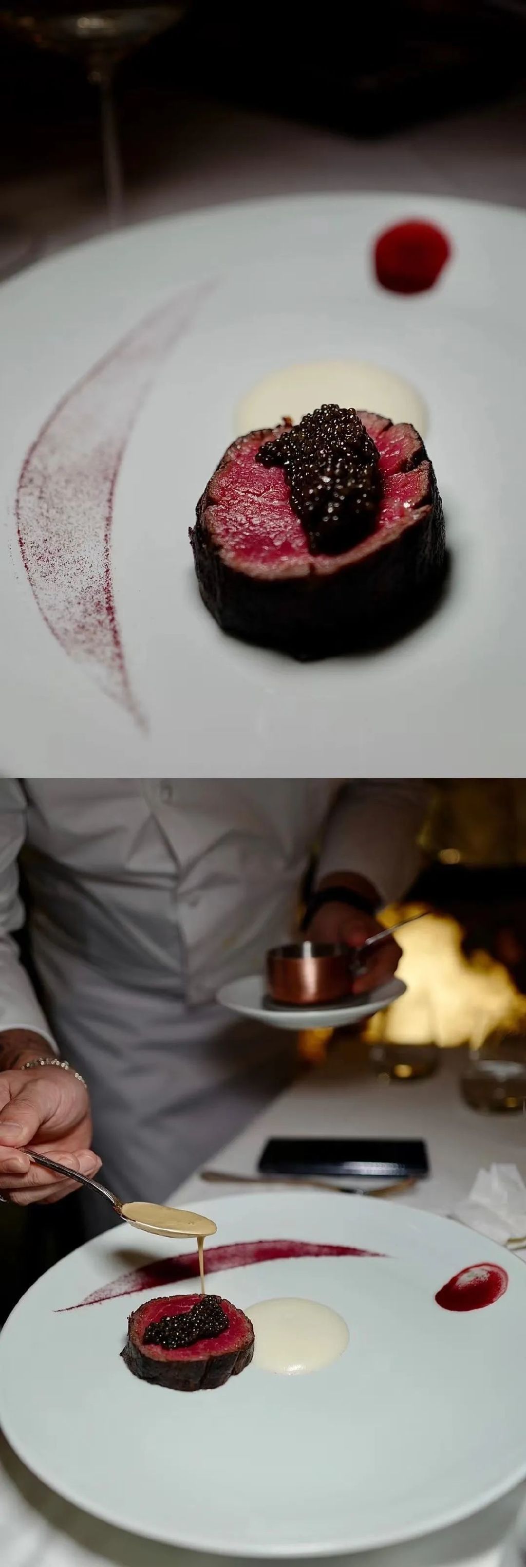 而昨夜的追逐,应还给Ling本人,他对大董老师说,这顿饭,等了您两年。澳洲Infinite的M9从尊贵客人进店,Ling就开始用“高温慢烤”的方式料理,然后压轴上。他需要1个半小时的反复翻转,才能让一块好牛排浴火重生,1分熟,无任何血水,口感细腻绵软。他定制的鱼子酱降了0.5%左右的盐度,是牛肉的鲜美伴侣。