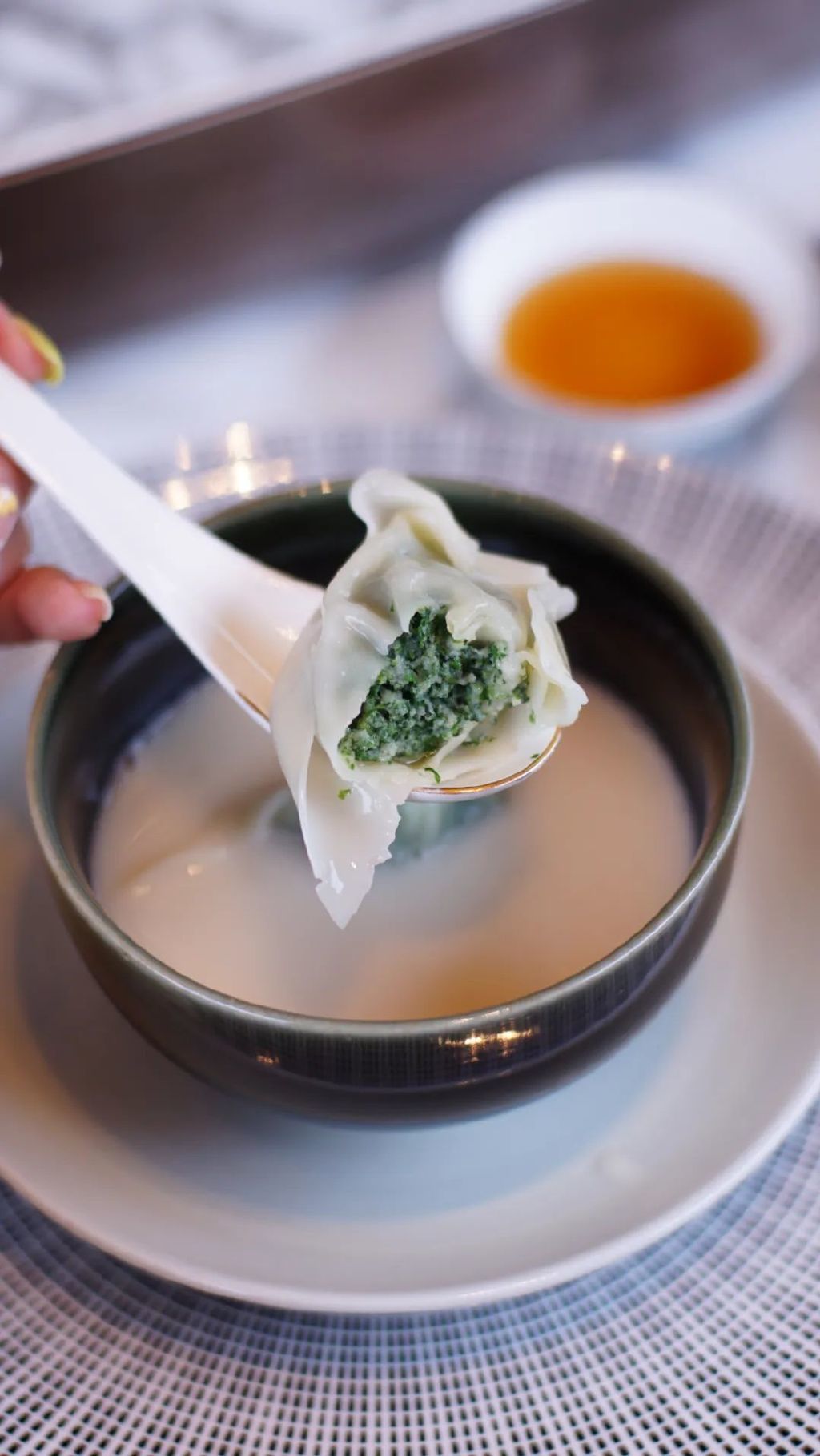 手工刀鱼馄饨皮很薄,馅儿加的是荠菜,整一个绵柔细嫩。春宴焕新,尝春常新。