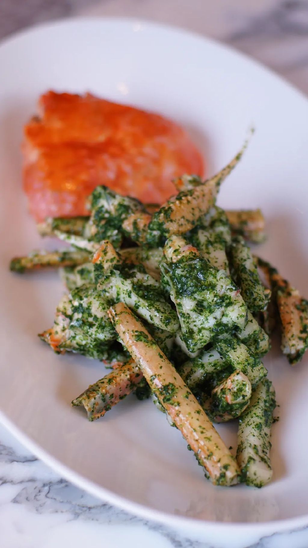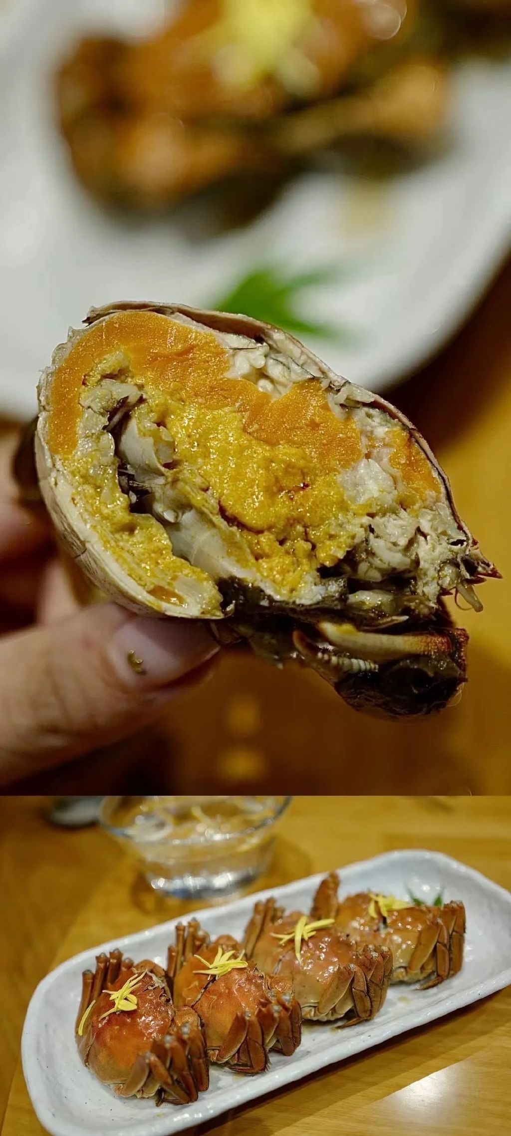 程郁师傅自己很喜欢松叶蟹,春天就用荠菜年糕炒,他还笑说春天的大黄鱼也要春的做法,用自制香椿酱生焗再好不过。