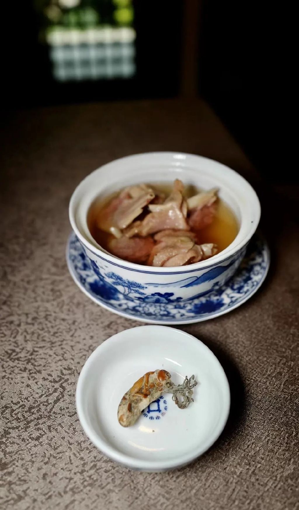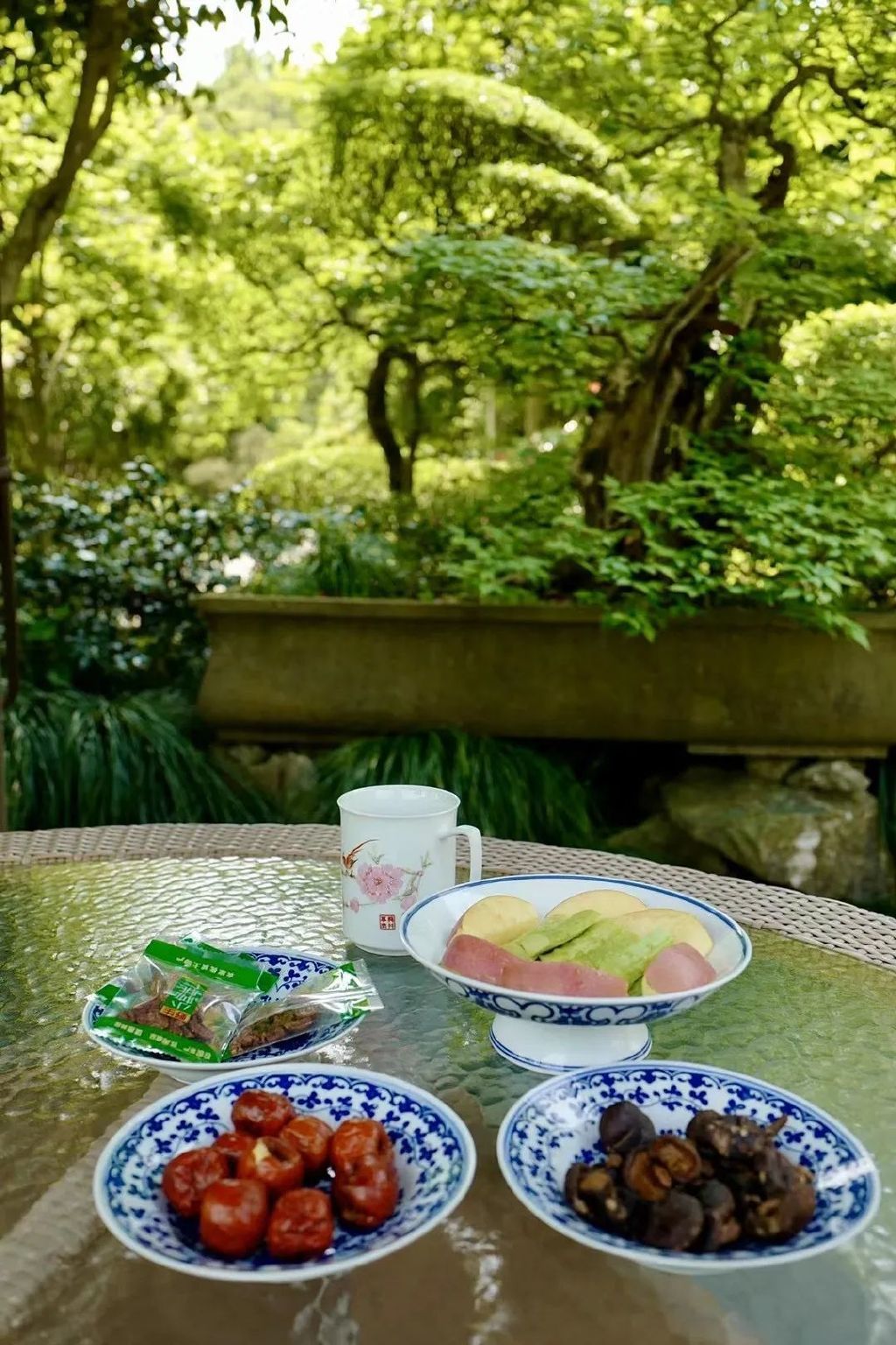想歇歇,少不了饭间隙与收尾,佐以金蝉银翎(金蝉花老鸭汤)、桃胶玉芡(鸡头米桃胶芡实甜汤),润肺顺胃。散步是必须的,我享受在这里拾级闻香,一步一处花草气,边看书法奇石,妙处不同。