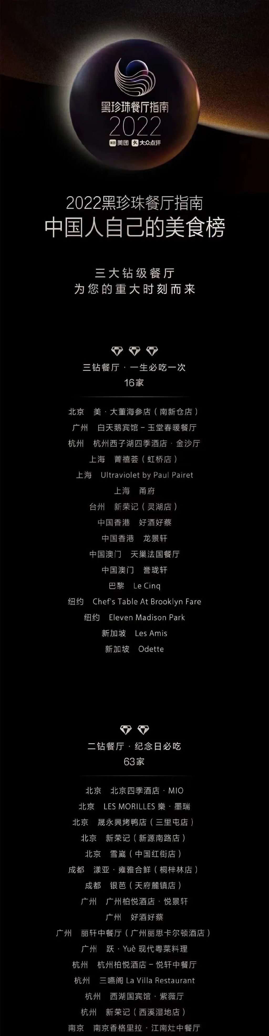 姑娘就似黑珍珠,有心等,就能吃上,况且还有那么多呐!2022年,在全球736家入围餐厅中,共有283家钻级餐厅脱颖而出,覆盖国内北京、上海、深圳、广州、澳门、香港、台北、成都、重庆等22个城市以及海外纽约、曼谷、新加坡与巴黎四城(因疫情原因,东京今年暂停发布)。“黑珍珠餐厅指南”已是第五年发布,它见证着东西方美食齐首进步、文化高度交融的五年。