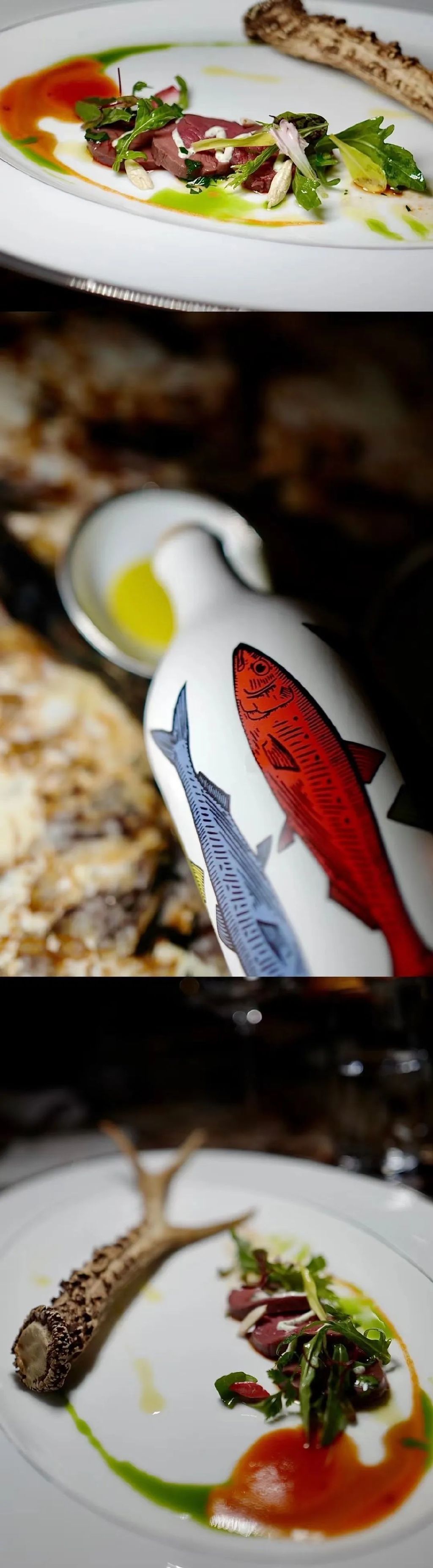 多种香草油“绿油”,再加微辣的chill & tomato “红油”,配合少量茴香根泥和发酵蒜味橄榄油,最后还有榄仁呼应香气。而牛舌配的是陈皮意大利醋,有红菜头泥的蒜泥蛋黄酱做衬底。外国友人会疯!