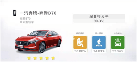 奔腾B70就是这么一款好车,在C-NCAP最新的碰撞测试中,它的综合得分率为90.3%,其中主动安全得分率97.34%,已经接近了满分成绩,也是主动安全系统广泛运用以来,难得的好成绩。