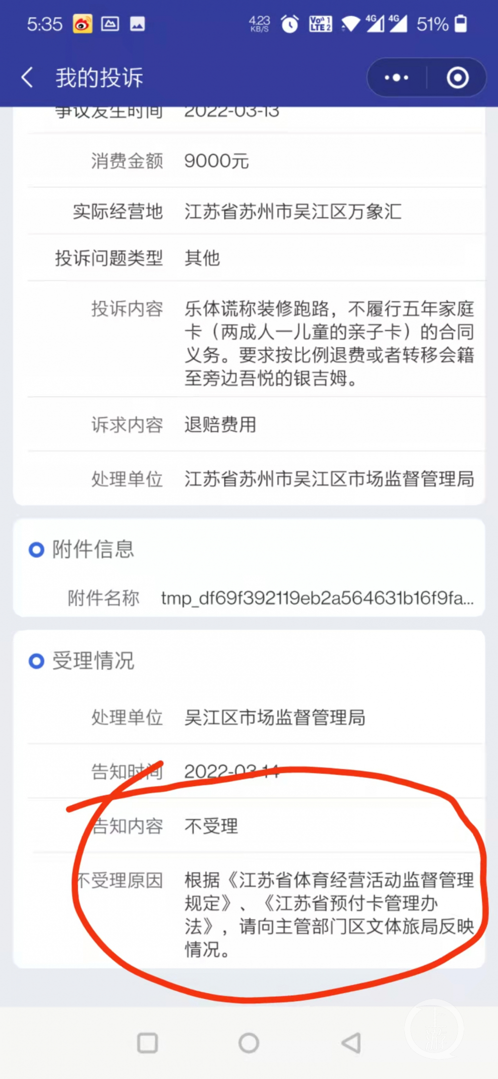 乐体健身消费者向吴江市场监管部门投诉,被告知不受理。 图片来源/受访者供图