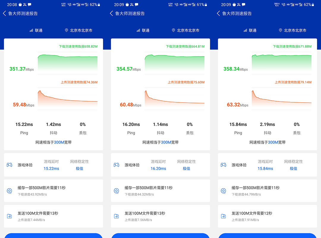 针对京东云无线宝AX6600的无线覆盖强度测试,主要分为三个场景:客厅室内无遮挡直测,卧室间隔一堵加气砖墙测试,卫生间间隔一堵钢筋混凝土墙测试。测试前打开路由器的“双频合一”功能,让路由器根据设备的信号强度自动调节频段,且每个测试场景均进行3次测速以降低误差。测试环境所使用的宽带为北京联通300M家庭宽带,标称上行50Mbps,标称下行300Mbps,光猫作为主路由,京东云无线宝AX6600路由器采用NAT3模式作为二级路由。需提前说明的是,因为当前运营商都会给用户预留一部分冗余带宽,所以在测试中出现了超过标称带宽的情况为正常现象。