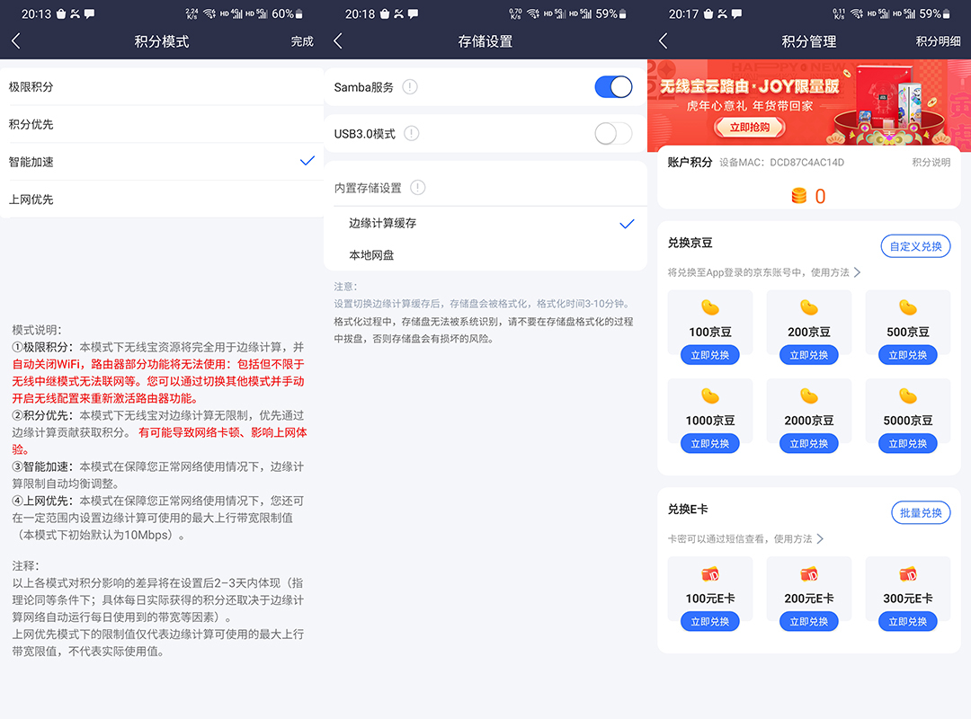京东云无线宝AX6600路由器可以自行设定积分模式,让用户自己决定路由器上网和边缘计算的工作比例;我们也可以通过“存储设置”管理内置存储的工作模式,可以选择完全作为路由器的本地硬盘进行网络共享使用,或者是作为边缘计算的缓存盘使用。另外,边缘计算收益的积分,也可以通过积分管理板块兑换京东或者E卡,随用随换十分便捷。