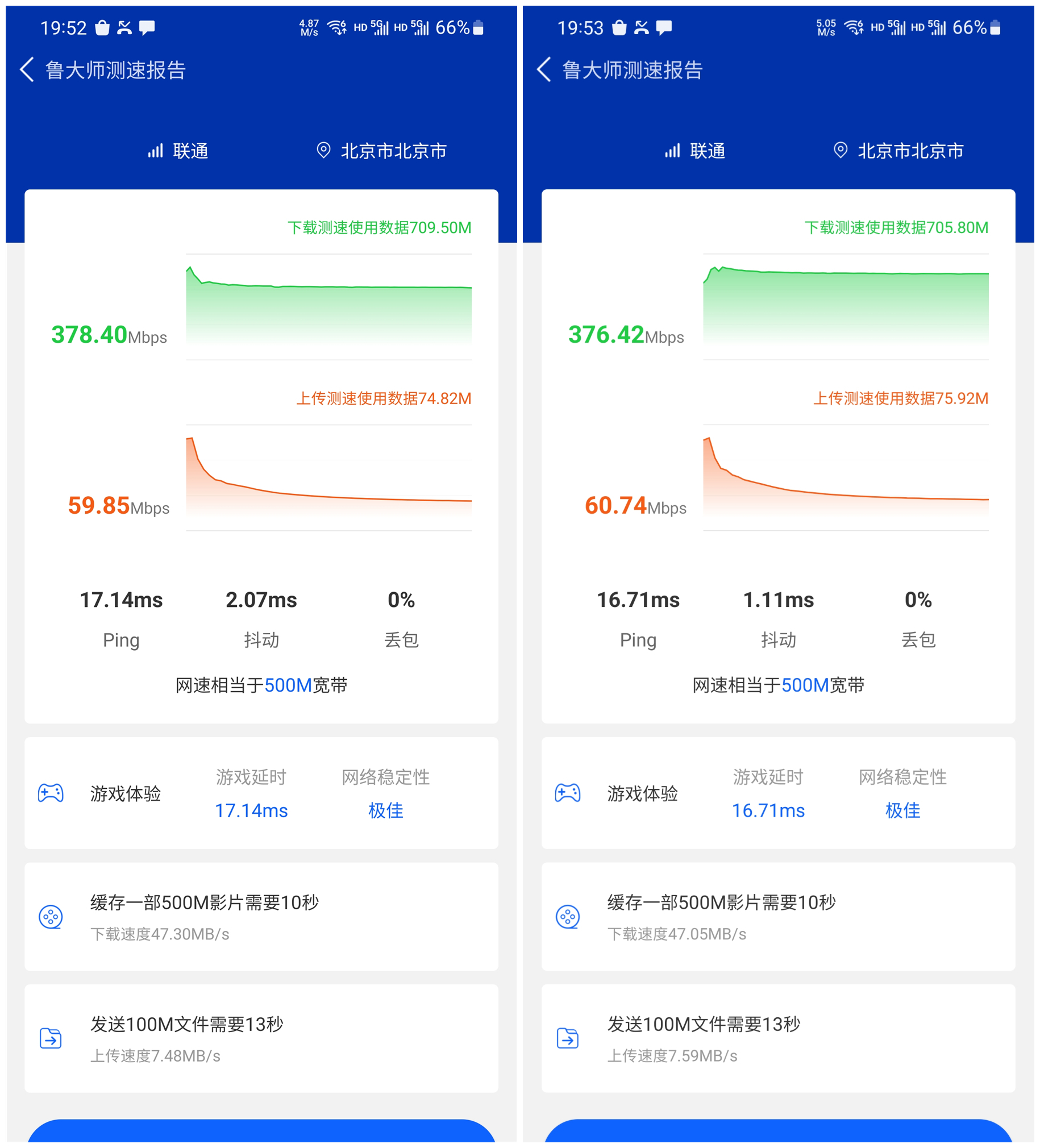 最后是在卫生间间隔一堵混凝土墙进行测试,因为卫生间墙体内除了有钢筋外,部分金属管道也会影响电磁波的传输,这也就是为什么我们平时在卫生间使用WiFi信号会变得很弱的原因。我们测试使用的手机,在卫生间的信号虽然与客厅和卧室相比少了一格,但是传输速率却没有明显降低,游戏的延迟也在正常范围内。除了信号强度有所变化外,在使用体验上基本上与其他环境无明显差别。