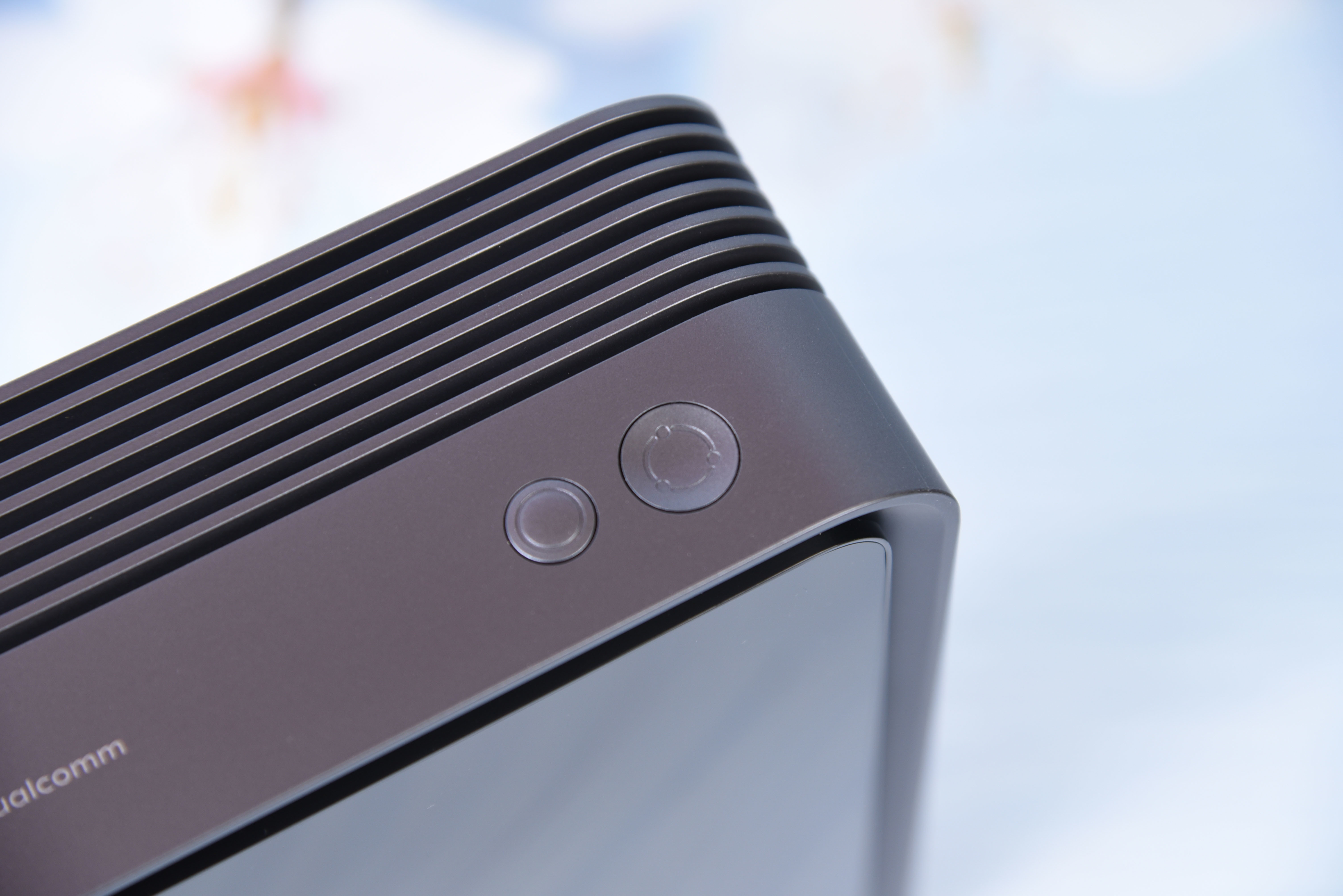 路由器四周的银灰色边框表面采用了类肤质涂层,触摸手感较为舒适,并预留了条形散热格栅。上方右侧预留了两个实体按键,分别为屏幕显示内容切换键和Mesh组网按键。