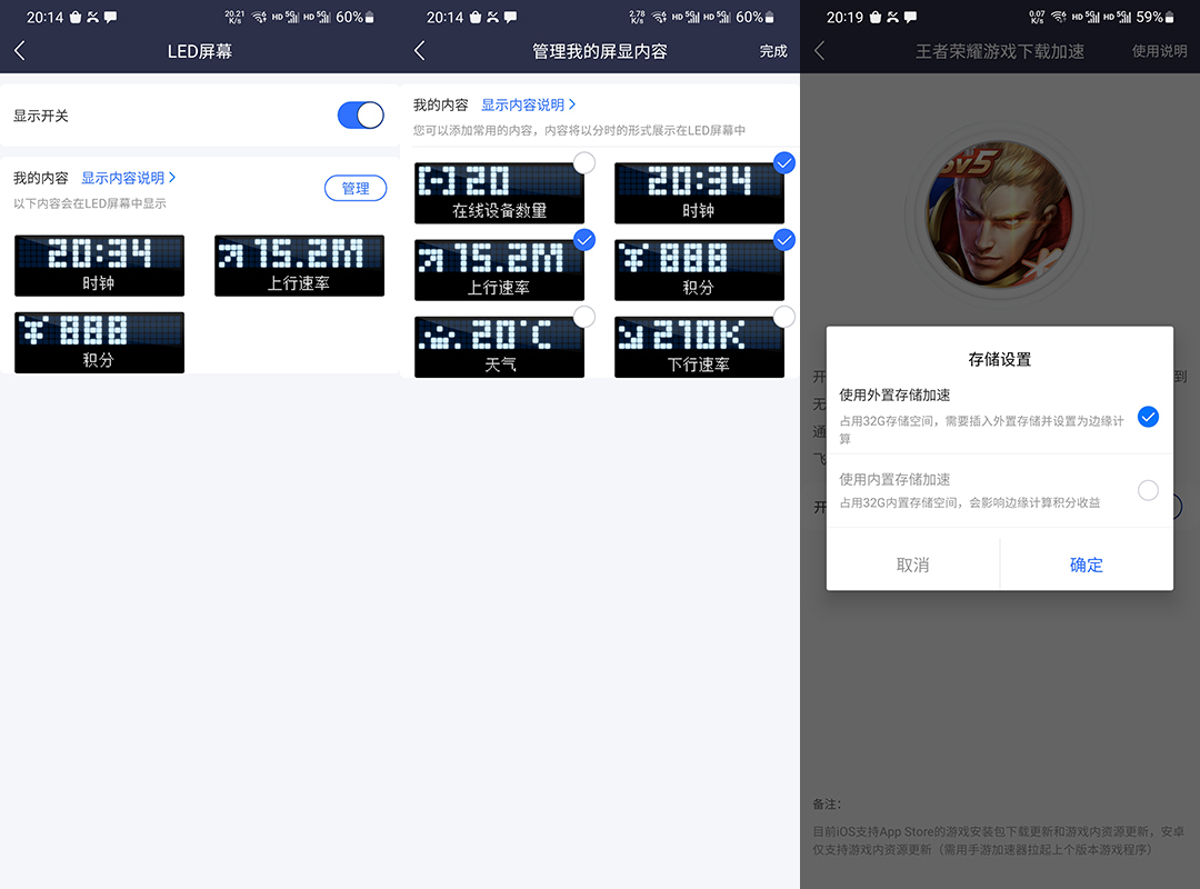 路由器正面的那块LED屏幕,也可以通过APP的“LED屏幕”设置项针对显示内容进行修改,目前APP内支持显示时钟、天气、在线设备数量、账户积分、上下行速率等信息。