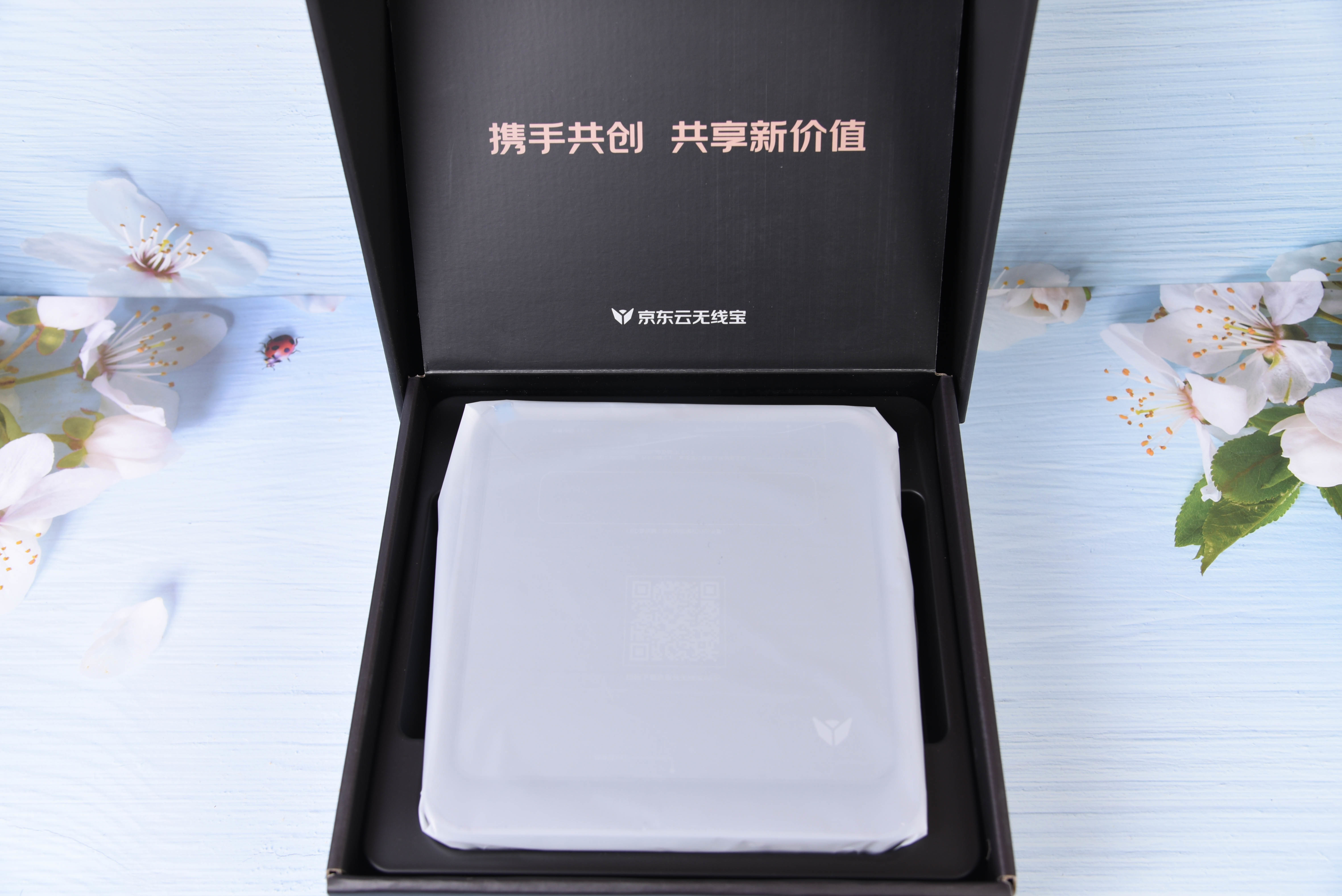 包装盒内部采用了书型双层设计,掀起上层包装即可看到内部的路由器本体。包装盒内部印有京东云无线宝的Slogan“携手共创 共享新价值”,也预示着这款路由拥有的共享带宽赚收益的互利模式。