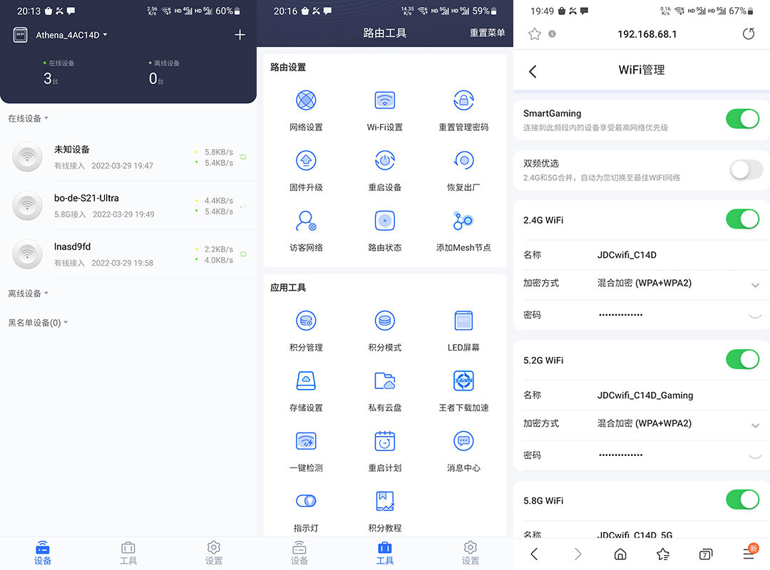 此外,我们还通过无线宝APP,对无线宝路由器的玩法进行了进一步的探究。与目前大多数智能路由器相比,京东云无线宝AX6600除了拥有常规性的路由设置、WiFi设置、显示在线设备、远程管理路由器之外,还支持更改积分模式、修改LED屏幕显示内容、更改存储设置、搭建私有云盘、以及缓存资源加速等功能。