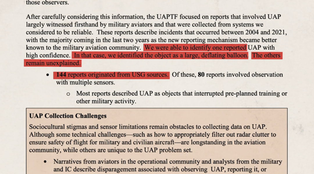 2021年6月25日,美国国家情报主任办公室发布了一份UFO报告,其中提到,美国军方多年来观测到144起UFO事件,其中有一次可以基本确认是气球。