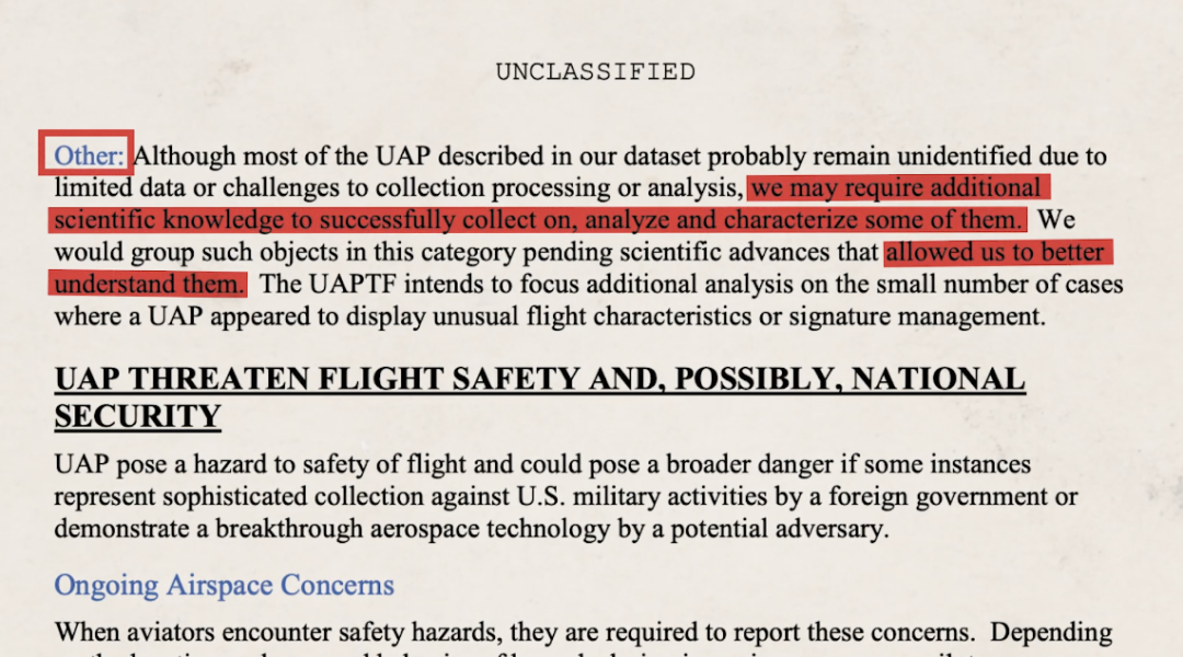 报告说,这些UFO有几种可能:空中杂波干扰、自然大气现象、美国的某些秘密实验、外国的黑科技,以及其他。至于到底是哪种,以及什么叫其他,报告说,不好意思,没有足够的证据我们也说不好。