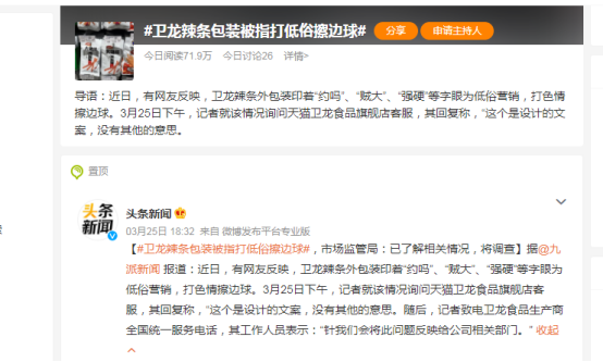 近日,有网友反映,卫龙辣条外包装印着“约吗”、“贼大”、“强硬”等字眼为低俗营销,打色情擦边球。3月25日下午,记者就该情况询问天猫卫龙食品旗舰店客服,其回复称,“这个是设计的文案,没有其他的意思。随后,记者致电卫龙食品生产商全国统一服务电话,其工作人员表示:“针我们会将此问题反映给公司相关部门。