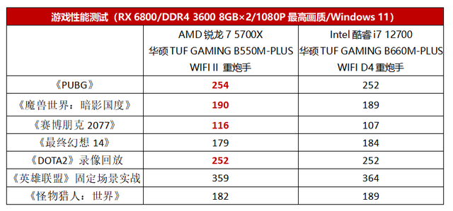 其实,从众多的测试可以看到,8核心16线程已经能够轻松满足当下3A游戏大作的需求,额外增加核心并不能带来明显的提升,更何况增加的是频率和性能更低的能效核。为了证实这一点,接下来,我们分别使用8核16线程的锐龙7 5700X和“8大核+4小核”的酷睿i7 12700两款“7”字辈的处理器搭配AMD Radeon RX 6800显卡来进行对比,看看实际情况如何。