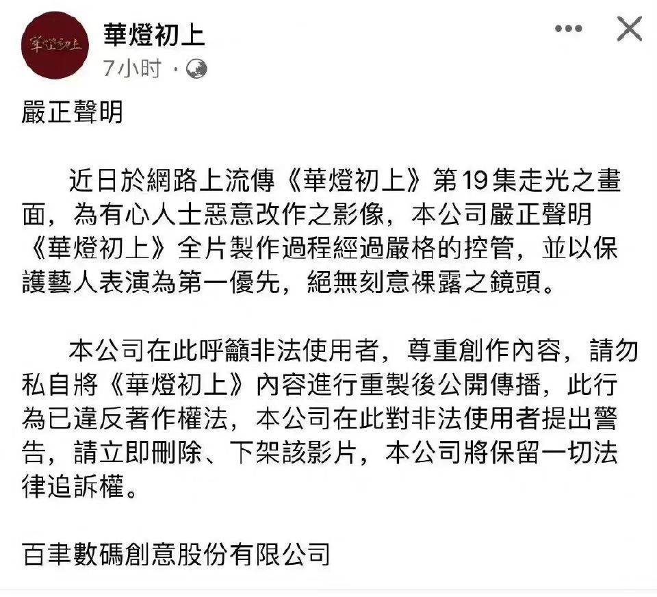 事发之后,剧组方面首先出来发声明辟谣。直言网传视频为有心之人恶意改造的作品,并非《华灯初上》的片花内容。剧组为了保护艺人坚持表演第一,绝对没有不合规的镜头。此外,剧组方面还呼吁制作者,希望他们能在第一时间下架该影片,停止「谣言的传播」。