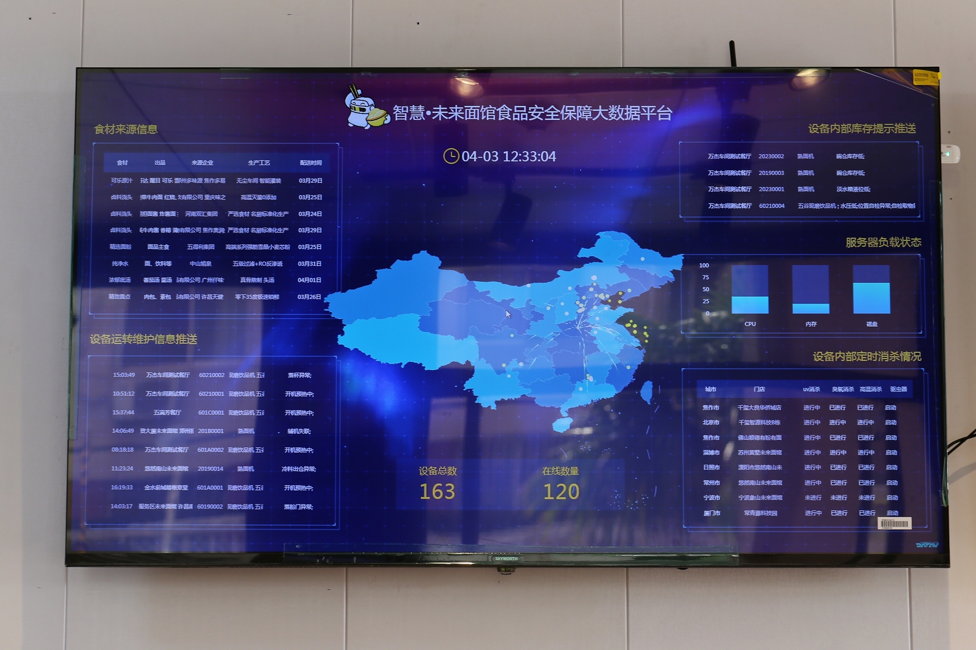 未来面馆还依托5G通讯和阿里云服务器,实现对设备数据采集、状态控制、参数调整等功能,结合大数据,通过使用自建的物联网设备管理平台可以有效管控设备的清理、消毒(定时强制)、灭菌(定时强制)等功能,方方面面保障食品安全。