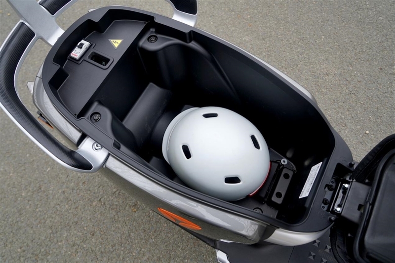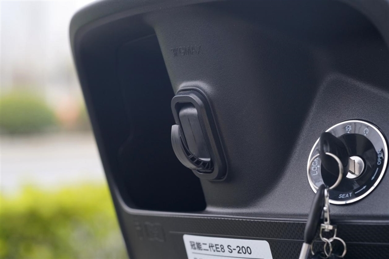 打开座椅,冠能二代E8S的内部储物空间非常足。高达32L的大座桶,把头盔放进去后空间依然阔绰,收纳充电器、雨衣、雨伞等物体都没有问题。