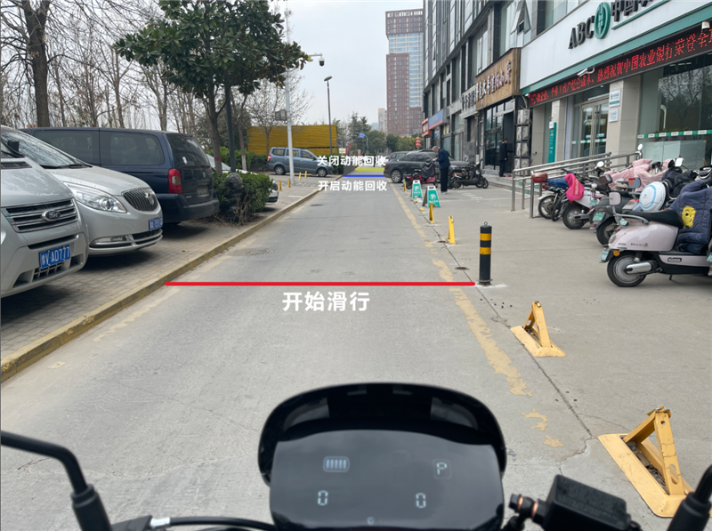 在开启动力回收时,大概可以滑行到前方蓝线的位置,关闭后则更远,直接滑到绿线的位置,二者之间的间距大概有20米左右。