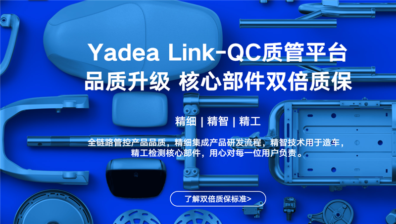 冠能二代E8S搭载Yadea Link-QC质管平台智造,全链路管控产品品质,以精细的集成产品研发流程、精智的双驱智造、高于国家标准的精工检测,用心对每一位用户负责,成就更高品质的电动车,电机、控制器等这些核心配件享有加倍的质保服务。