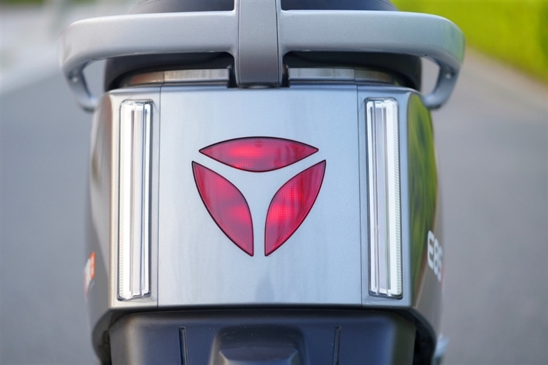 后侧,依旧是特色的雅迪LOGO尾灯,红色面积很大,警示性很强。两侧还有转向灯和反光镜一体的设计。