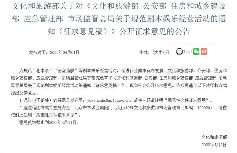 日前,据文化和旅游部官网消息,五部门(文旅部、公安部、住建部、应急管理部、市监总局)起草了《关于规范剧本娱乐经营活动的通知(征求意见稿)》,面向社会公开征求意见,旨在规范“剧本杀”“密室逃脱”等剧本娱乐经营活动,意见反馈截止到本月11日。