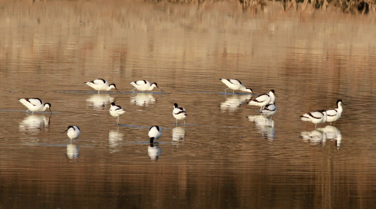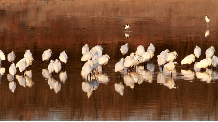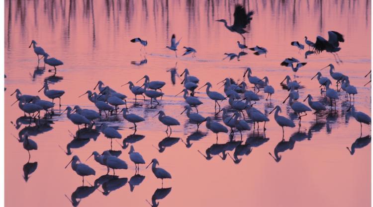 晨光中一群白琵鹭在水面觅食。河北日报通讯员赵永春摄影报道