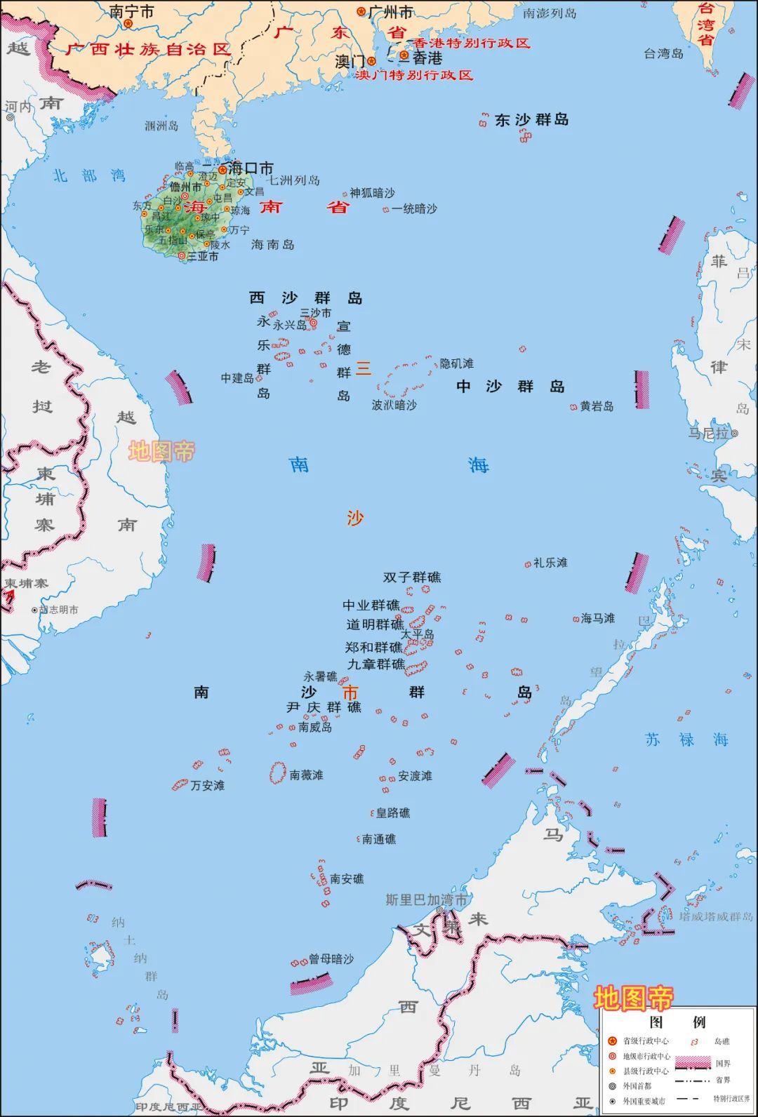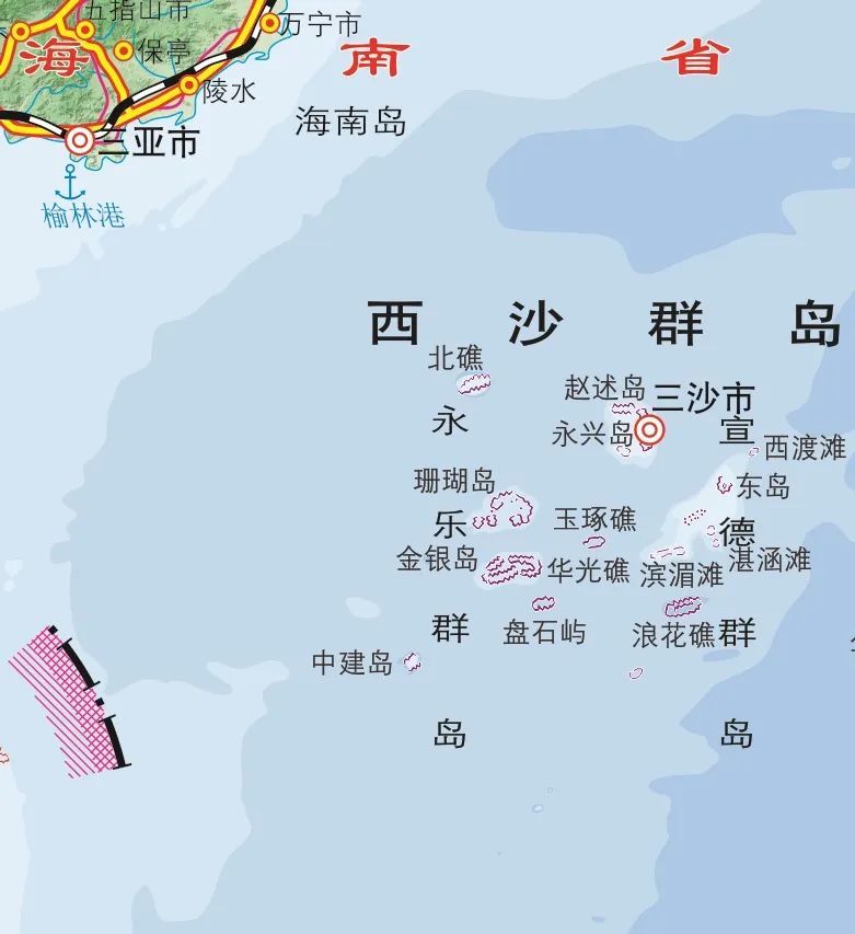 2012年,海南省三沙市成立,辖西沙群岛、中沙群岛、南沙群岛的岛礁及其海域(东沙群岛属广东省汕尾市)。