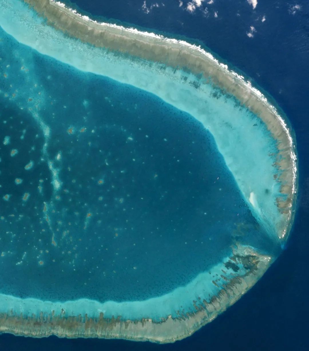 黄岩岛略呈三角形,四周是珊瑚礁,中间围成一个大潟[xì]湖(咸水浸渍的湖泊),水深约10至20米,湖水清绿,与礁外蓝黑海水不同。黄岩岛东南部有一个缺口,水深9至11米,宽约400米。