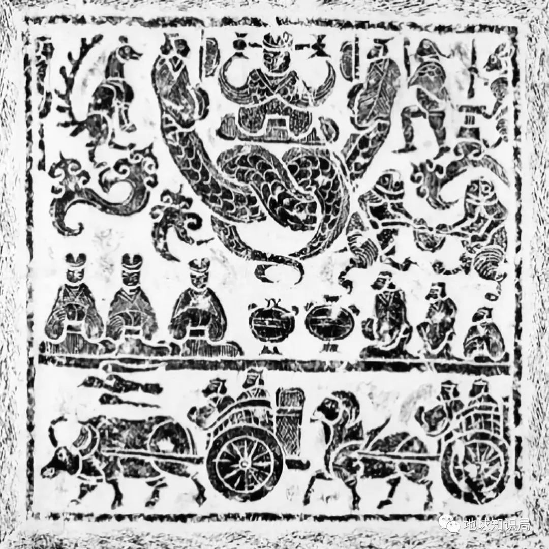 汉代画像石,西王母居中,伏羲女娲在侧