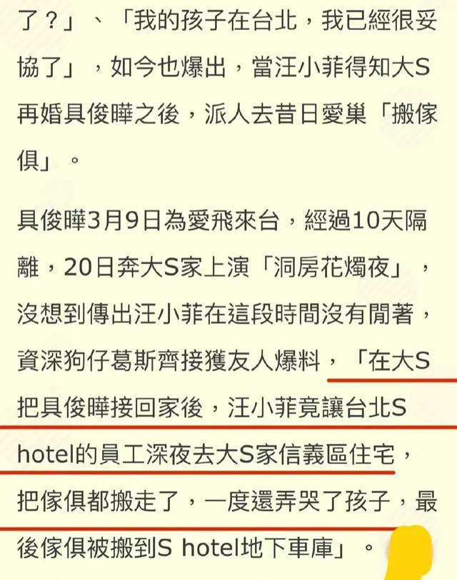 反正,外界看到的现实就是,台湾某娱记爆料的那样,汪小菲派他在台北S酒店的员工,跑到大S豪宅里,当着大S和她新婚老公具俊晔、还有两个孩子的面,搬走了当年他给台北豪宅婚房添置的各种家具。汪小菲宁可把这些“爱的鉴证”,放在S酒店地下车库的角落里落灰,也不肯再让大S和她的新婚老公具俊晔用。