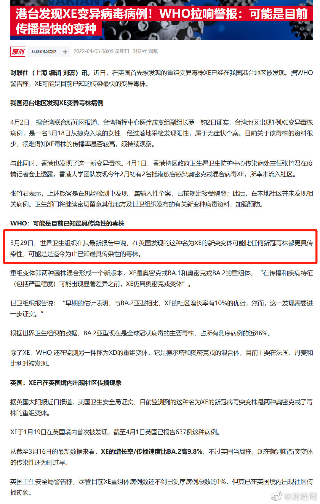 【港台发现XE变异病毒病例!WHO:#XE病毒或成目前传播最快新冠变种#】据财联社消息,近日,在英国首先被发现的重组变异毒株XE已经在我国港台地区被发现。这种名为XE的新冠病毒是奥密克戎BA.1和奥密克戎BA.2的重组体。3月29日,世界卫生组织在其最新报告中说,在英国发现的这种名为XE的新突变体可能比任何新冠毒株都更具传染性,可能是迄今为止已知最具传染性的毒株。