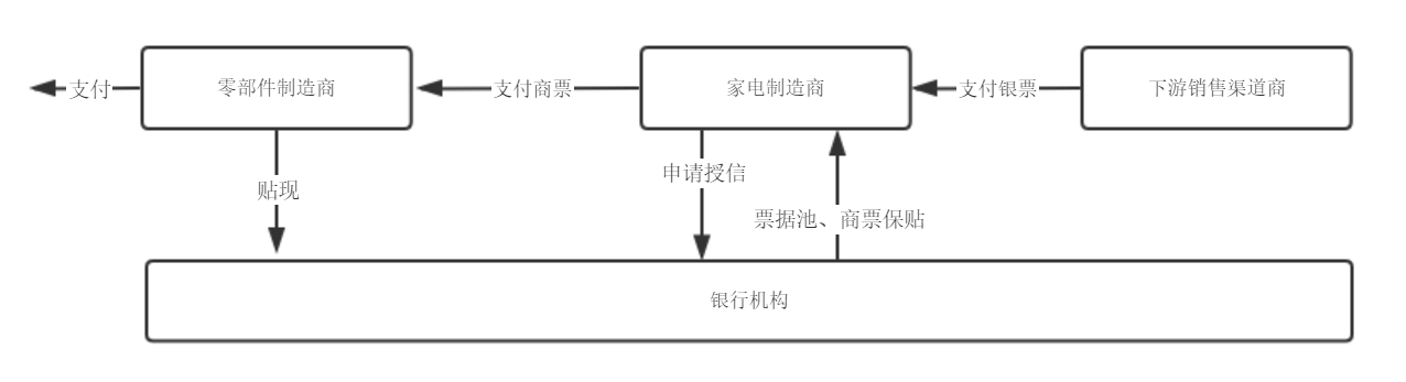 家电制造商。家电行业中游环节即家电制造商在不同的细分子行业中具有差异性地位,因此本文分具体细分子行业对家电制造商进行分析。白电产业链中家电制造商盈利能力较好,占用上下游资金能力较强,在产业链中有较强话语权,对上游零部件厂商具备一定的议价优势。对下游(一般是自己的销售部门或公司,货款回笼需要一定的时间。另一些可能是代理商或自营卖场,有些赊销有些先款后货),家电制造商一般先预收部分货款,同时给予家电连锁 14 天-1 个月不等的账期,80%货款采用票据结算。家电制造商向银行申请办理票据池业务,并将下游支付的银票入池产生票据池额度,并向上游签发商票,该部分商票可凭家电制造商的票据池额度产生商票保贴额度,上游零部件制造商收到商票后可随时到银行办理贴现融资,通过此种模式,可以有效的解决家电制造商本身存在的大量票据管理问题,并解决上游应收账款融资难题,从而实现做大整条产业链产值的效果。