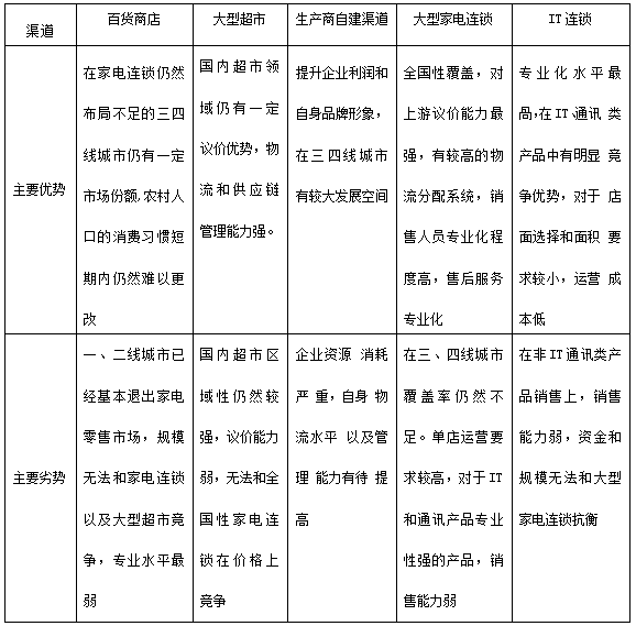 下游销售环节运行状况。目前我国家电销售渠道有传统的大、中型百货商场,有仓储式大型连锁超市,有品牌专卖店,有经销商(批发企业),也有个体商户等等。其中,家电连锁和经销商在销售管道中仍占主要地位,新兴的网络渠道近年也发展迅速。