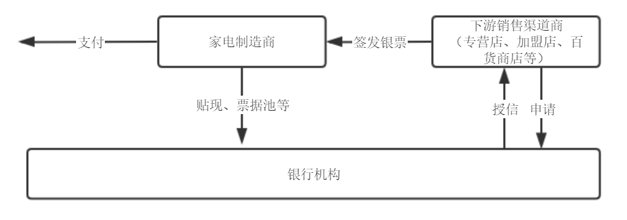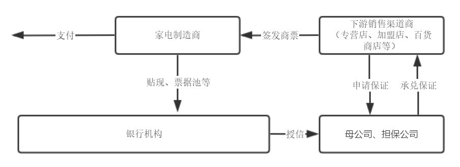 以家电制造商为主导的下游企业,如海尔、TCL等家电制造业巨头自建销售渠道,包括专营店、经销商(加盟合作形式)、百货商店,该模式下家电制造商较下游企业表现强势,对供应链的控制能力强,产品价格、供应量由家电制造商决定。针对有一定实力,能够获得银行授信的此类下游渠道商,可向银行申请授信,签发银票支付给家电制造商,仅需向银行缴存少量保证金或不缴存即可支付全额货款,加快了下游企业资金周转经营。