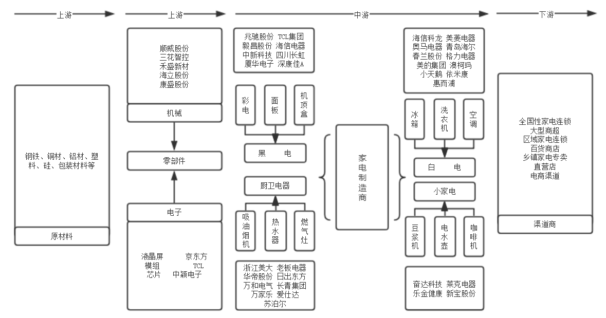 我国家电产品制造业目前的产业链主要由原料供应、零部件制造及电路板部件制造、家电产品总装、产品分销及最终零售、以及研发设计、售后等相关配套服务构成。