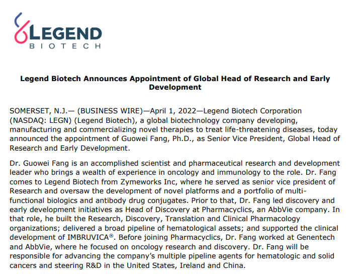 4 月 1 日,国内细胞疗法公司传奇生物(NASDAQ:LEGN)官方发布一则人事变动公告,任命方国伟博士为传奇生物高级副总裁、研究与早期开发全球负责人,其将正式接任 2022 年 3 月 30 日从传奇生物离职的范晓虎博士。