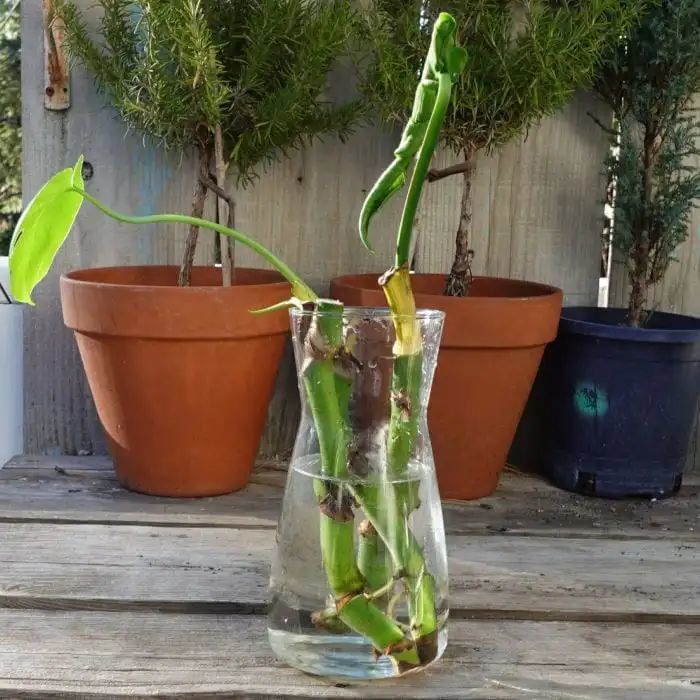 将晾干伤口的龟背竹枝条底部浸泡在水中,比如下方这种玻璃容器,也可以用其他透明的容器代替,每隔一周换水一次,这是为了避免水变浑浊,水质清新更有利生根,如果有山泉水、雨水等,更有利促进生根。