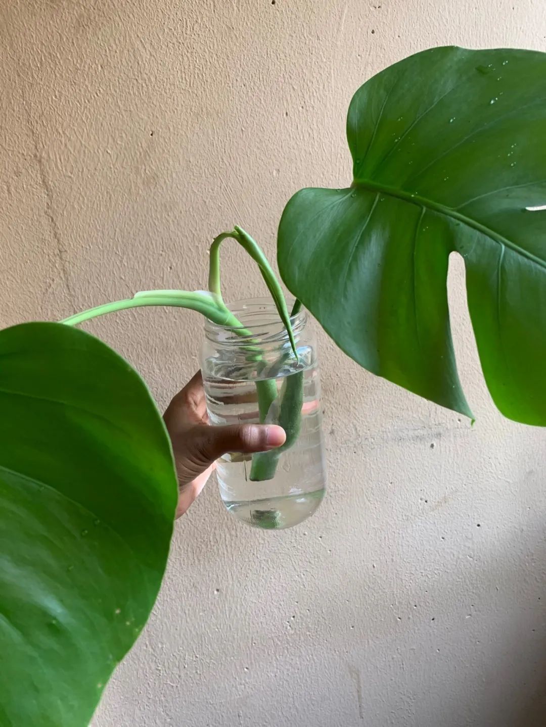 如果你有生根粉,可以兑水后将龟背竹的枝条放在生根溶液中浸泡半小时,再用来水培或土培扦插,可以提高生根的速度。