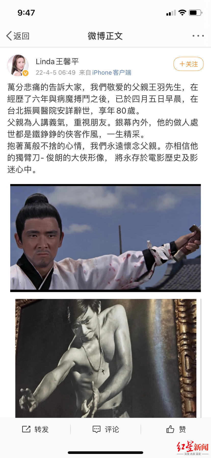 歌手王馨平在微博发文表示:“万分悲痛的告诉大家,我们敬爱的父亲王羽先生,在经历了六年与病魔搏斗之后,已于四月五日早晨,在台北振兴医院安详辞世,享年80岁。父亲为人讲义气,重视朋友。银幕内外,他的做人处世都是铁铮铮的侠客作风,一生精采(彩)。抱着万般不舍的心情,我们永远怀念父亲。亦相信他的独臂刀——俊朗的大侠形像(象),将永存于电影历史及影迷心中。”