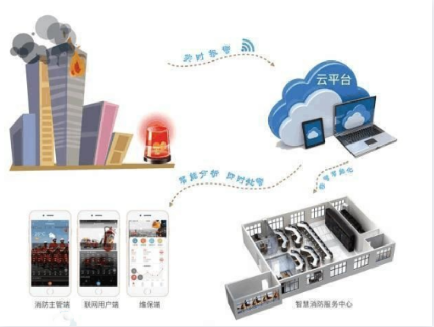 智慧消防以先进的物联网手段,实时监测消防系统的运行状态;及时发现火情信息并上传至云平台,智能分析火情并将报警信息推送至联网单位及消防主管部门,实现快速出警,节省宝贵救援时间,运用科技手段减少并避免火灾损失。
