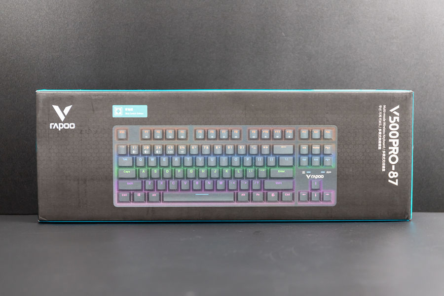 雷柏V500 PRO-87多模版机械键盘的外包装延续了雷柏一如既往的简洁风格,外包装的蓝黑配色让人一眼就知道这一款产品来自于雷柏。而在外包装上,还展示了雷柏V500 PRO-87多模版机械键盘这一款产品的外观。