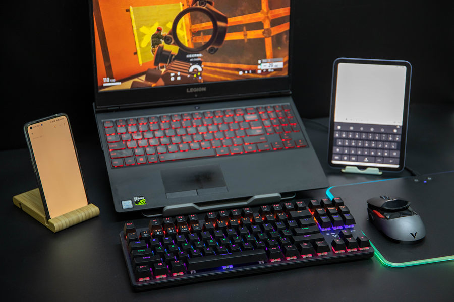 雷柏V500 PRO-87多模版机械键盘支持多设备的连接,最多可以连接到五个设备。可以通过FN加上键盘上对应的F1-F5按键进行配对模式的切换,选择到不同的设备进行输入。