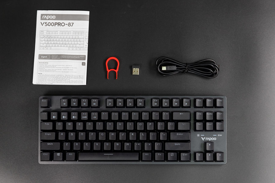 取下外包装,在里面的内容有雷柏V500 PRO-87多模版机械键盘、附带的2.4G接收器、USB-C连接线、拔键器、说明书,没有多余的内容,十分的简洁。