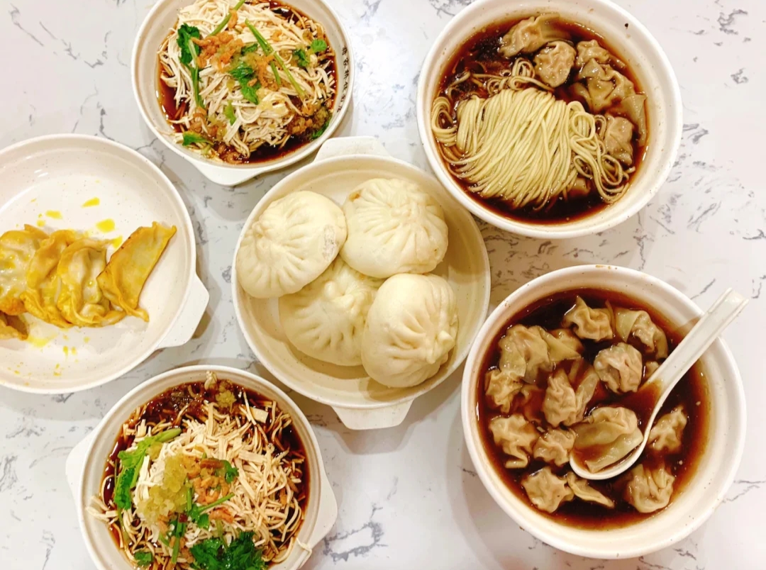 三丁包,五丁包,蟹黄汤包,细沙包,菜包,豆腐皮包,萝卜丝包,翡翠烧麦,淮扬烫干丝,京果粉泡金刚脐,千层油糕,大麻团,双麻烧饼,萝卜丝油端子,干拌面腰花汤,青椒肉丝面,镇江肴肉,八宝酱菜,腌姜咸菜,爆小虾儿,鸽蛋竹笙汤,锅贴,糯米糍饭,蒸饺,烧饼夹油条……