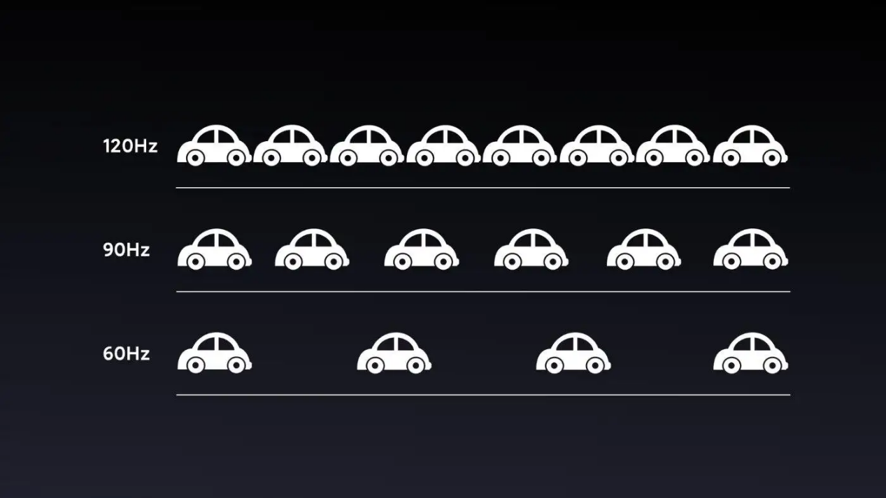 那么高刷新率究竟有着什么样的“魔力”让大家如此的趋之若鹜呢?我们不妨先来简单了解一下什么是高刷新率。刷新率一词以前在电竞显示器行业非常受关注,不过随着高刷新率手机、电视的出现,才真正让高刷新率这个词进入了大众视野。所谓刷新率指的是显示设备每秒刷新页面的次数,看视频时我们看到的其实是一副副连续快速切换的画面,这就是在刷新。 60Hz代表每秒有60个画面被刷新,120Hz则代表每秒120个画面被刷新。对于静态的画面而言,显示效果其实区别不大,但是如果是竞速比赛或者比较激烈的视频时,高帧率电视展现的过渡就越自然顺滑,看到的视频内容也就没有了拖影或者卡顿的现象。